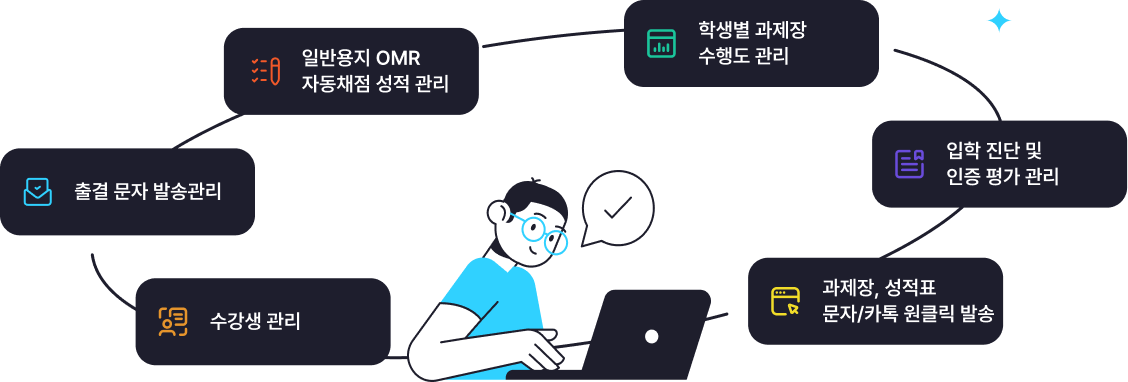 기존에 사용하시던 통합되지 않은 수강료 관리 시스템, 출결관리, OMR 성적관리, 문제은행 데이타베이스 시스템, 홈페이지를